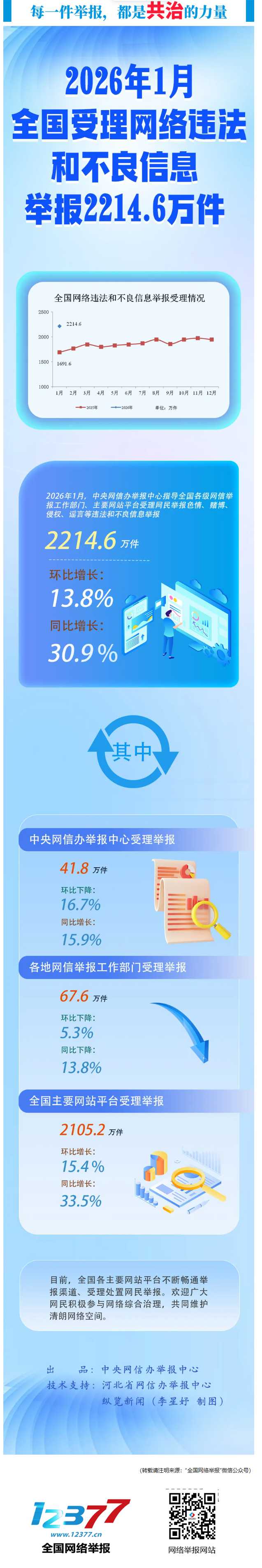 權(quán)威發(fā)布 | 1月全國(guó)網(wǎng)絡(luò)舉報(bào)2214.6萬(wàn)件