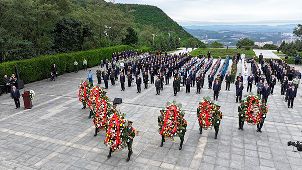 圖為敬獻(xiàn)花籃儀式現(xiàn)場(chǎng)。張哲遠(yuǎn)攝 今年9月30日是我國(guó)第十一個(gè)“烈士紀(jì)念日”。當(dāng)天,我市隆重舉行向革命烈士敬獻(xiàn)花籃儀式,深切緬懷革命先烈的不朽功績(jī),賡續(xù)紅色血脈,傳承紅色基因,激勵(lì)和動(dòng)員全市廣大干部群眾更加緊密地團(tuán)結(jié)在以習(xí)近平同志為核心的黨中央周?chē)?,深入學(xué)習(xí)貫徹黨的二十屆三中全會(huì)精神及省委、市委全會(huì)精神,聚焦市委“14510”總體思路和部署,以一往無(wú)前的奮斗姿態(tài)和永不懈怠的精神狀態(tài),堅(jiān)定不移推動(dòng)高質(zhì)量發(fā)展,不斷深化全方位轉(zhuǎn)型,奮力譜寫(xiě)中國(guó)式現(xiàn)代化陽(yáng)泉篇章。 雷健坤、劉文華、師旭明、任建華、郭衛(wèi)東等市四套班子領(lǐng)導(dǎo)出席儀式。市委副書(shū)記、市長(zhǎng)劉文華主持儀式。 天地英雄氣,千秋尚凜然。蒼松翠柏環(huán)繞,氣氛莊嚴(yán)肅穆。革命烈士紀(jì)念碑前廣場(chǎng)上,秩序井然、隊(duì)列整齊,革命烈士紀(jì)念碑巍然聳立,碑上“革命烈士永垂不朽”金色大字熠熠生輝,寄托著陽(yáng)泉兒女對(duì)英雄烈士的深切緬懷和崇高敬意。 上午9時(shí)許,向革命烈士敬獻(xiàn)花籃儀式正式開(kāi)始。市委書(shū)記雷健坤等領(lǐng)導(dǎo)同現(xiàn)場(chǎng)各界代表齊聲高唱國(guó)歌。國(guó)歌唱畢,全場(chǎng)肅立,全體人員向?yàn)橹袊?guó)人民解放事業(yè)和共和國(guó)建設(shè)事業(yè)英勇獻(xiàn)身的烈士默哀。 默哀結(jié)束,手持鮮花的少先隊(duì)員面向革命烈士紀(jì)念碑高唱《我們是共產(chǎn)主義接班人》,并致少年先鋒隊(duì)隊(duì)禮。在《獻(xiàn)花曲》的旋律聲中,14名禮兵抬起花籃,緩步走向革命烈士紀(jì)念碑,將花籃擺放在紀(jì)念碑前。雷健坤邁步上前,在花籃前駐足凝視,仔細(xì)整理花籃緞帶?;ɑ@紅色緞帶上書(shū)寫(xiě)的“烈士永垂不朽”格外醒目。鮮艷挺拔的紅掌、芬芳吐蕊的百合、輕盈綻放的劍蘭,寄托著對(duì)革命先烈的崇高敬意與深切哀思。 隨后,各界代表依次走近紀(jì)念碑和英烈榜獻(xiàn)花、瞻仰。 陽(yáng)泉軍分區(qū)主要領(lǐng)導(dǎo),市法檢兩院負(fù)責(zé)同志,市屬高校主要負(fù)責(zé)同志,市直單位和人民團(tuán)體主要負(fù)責(zé)同志,各民主黨派代表,城區(qū)、礦區(qū)、陽(yáng)泉高新區(qū)代表,老戰(zhàn)士、烈屬代表,老干部、老黨員代表,解放軍、武警官兵和政法干警代表,消防救援隊(duì)伍代表,退役軍人代表,工人、學(xué)生代表,民族宗教界代表,衛(wèi)生系統(tǒng)醫(yī)護(hù)代表等參加活動(dòng)。(張莉??魏君樺)